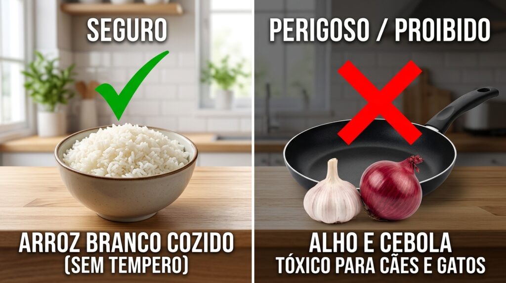 - O Perigo dos Temperos: Este é o erro mais comum. Você nunca deve dar ao cachorro o arroz que sobrou do almoço da família se ele tiver alho ou cebola. A cebola e o alho contêm substâncias que podem destruir as células vermelhas do sangue dos cães, causando anemia grave.