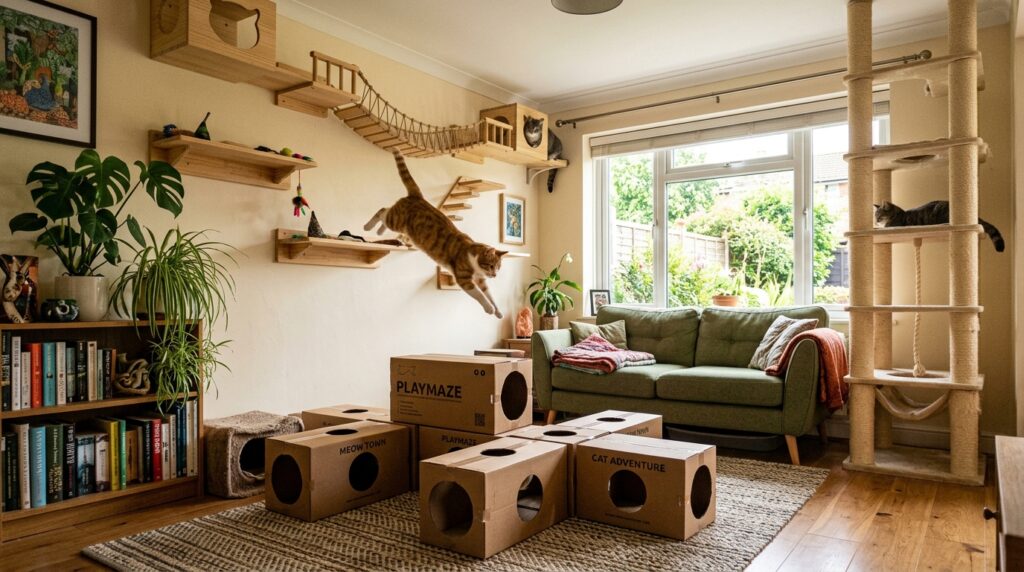 Brinquedos interativos, como varinhas com penas, simulam a caça e ajudam a reduzir os famosos “zoomies”. Além de divertir, eles mantêm o gato ativo e mentalmente estimulado.