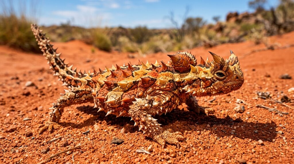 Este lagarto australiano vive em desertos áridos e parece ter saído de um conto de fadas, coberto de espinhos.